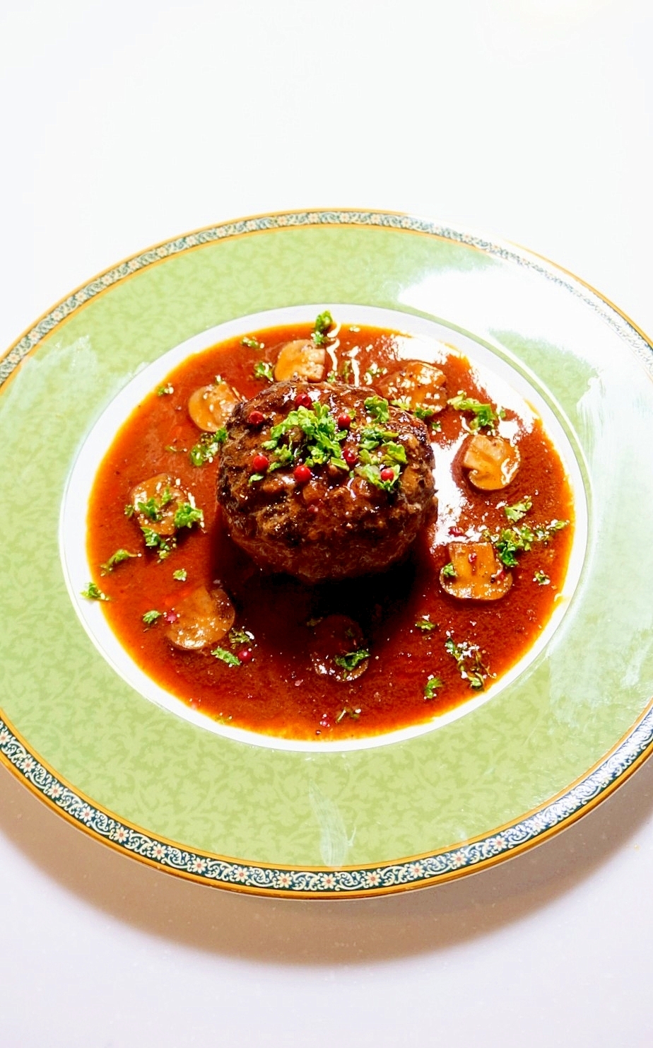 いったんフライパンで焼いた後でじっくりコトコト煮込んだハンバーグに~濃厚なマッシュルーム入りデミグラス風ソースが絡んで絶品です!