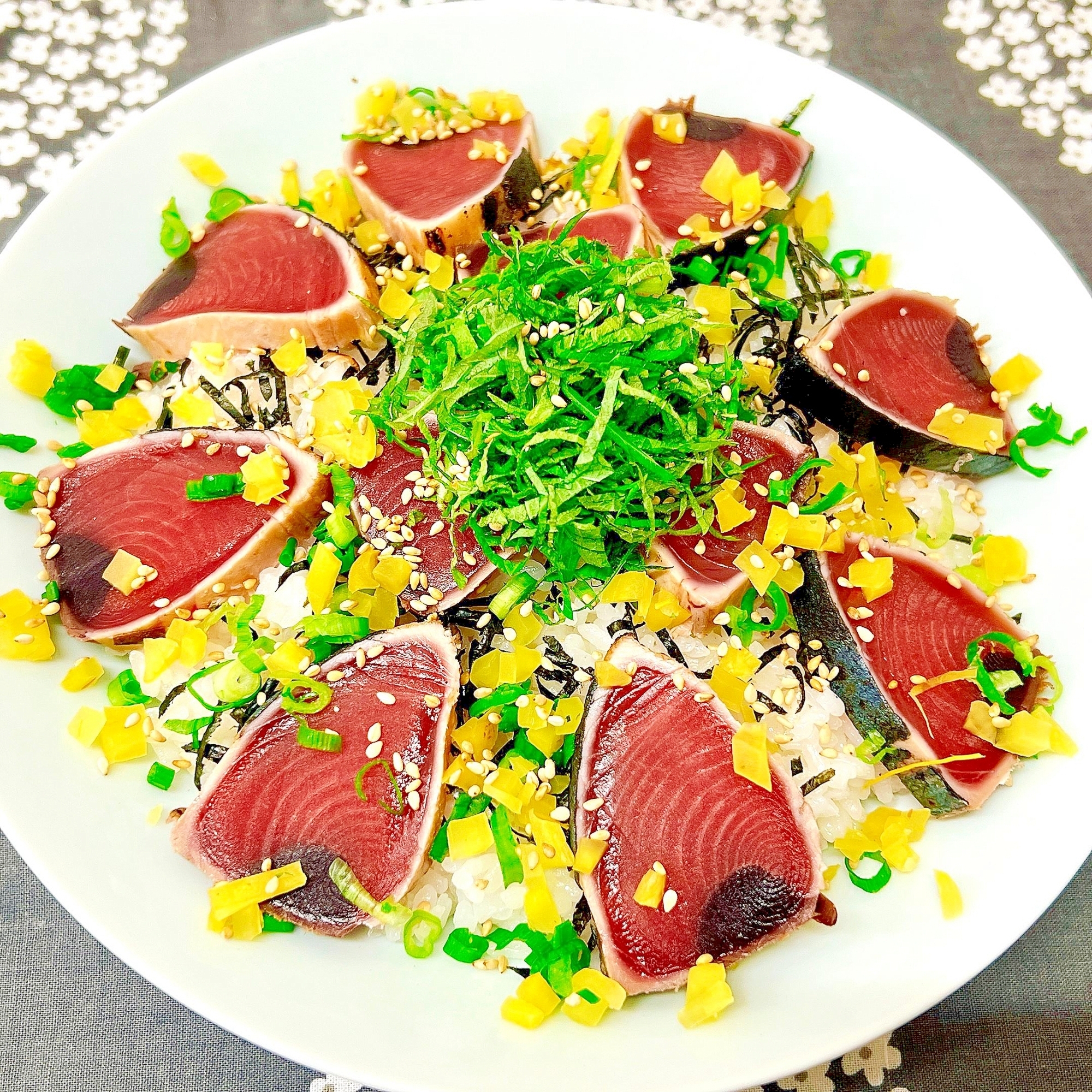 たくあんポリポリ!鰹のたたき丼 2026.01.09 鰹のたたきを、丼にしました。たくあんがポイントです。粗みじん切りにして乗せると、食感が楽しいです。大葉でさっぱりしています。海苔や胡麻の風味も、美味しいです。 レシピはこちら (楽天レシピ)