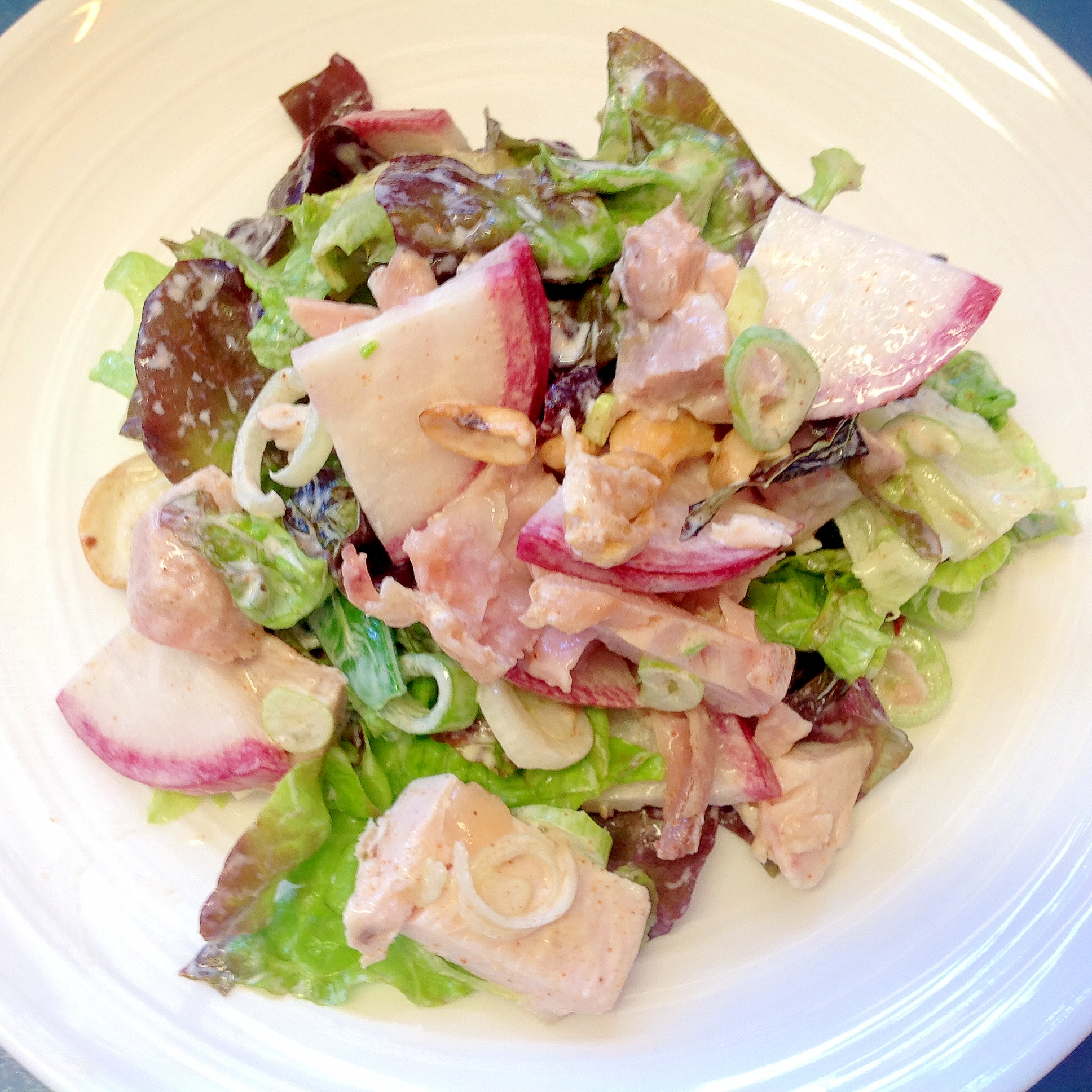 ローストチキンの残りをたっぷり使い、クランベリーとナッツを入れた食べ応えのあるサラダです
