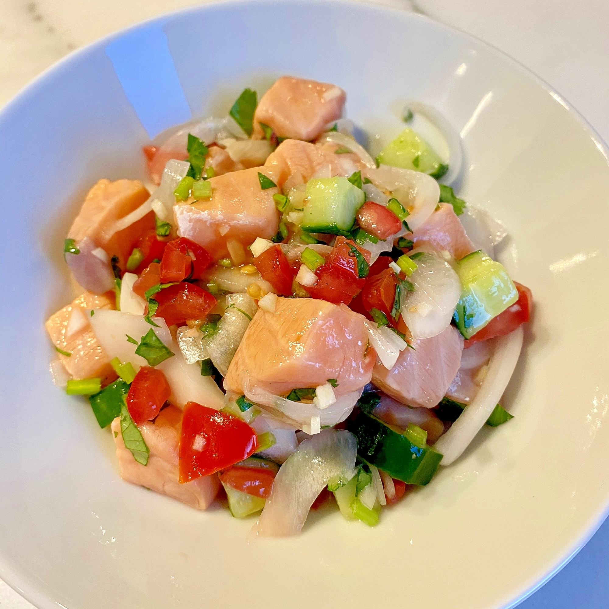 主夫がつくるサーモンのセビーチェ おつまみにも 2025.12.07 切って混ぜるだけの簡単おつまみです。 なお、セビーチェ(ceviche)とはペルー料理で、魚介類とレモン汁、玉ねぎ、トマト等で作られるマリネです。 レシピはこちら (楽天レシピ)