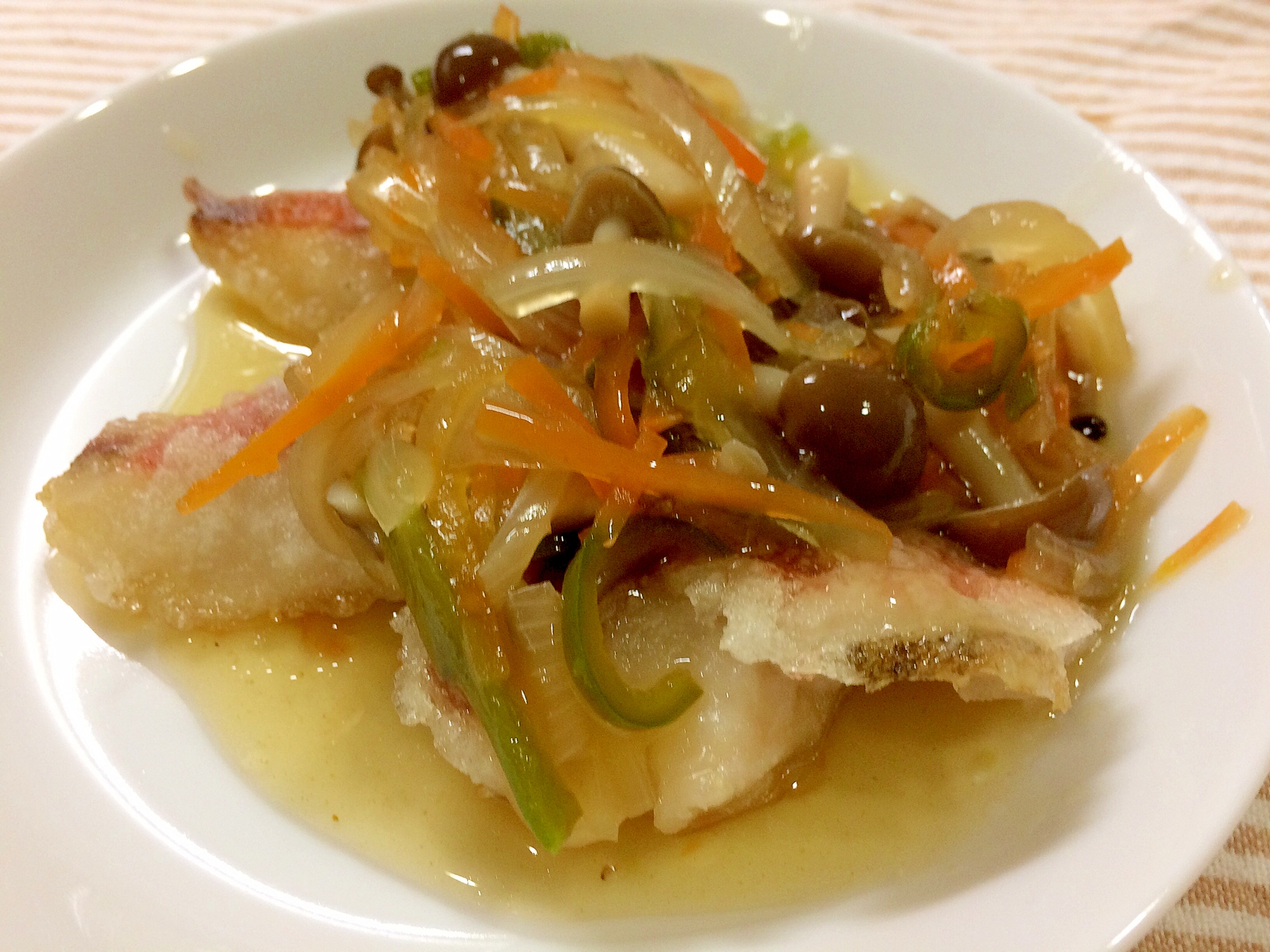 カリッと揚げ焼きした赤魚に簡単野菜あんをかけて。