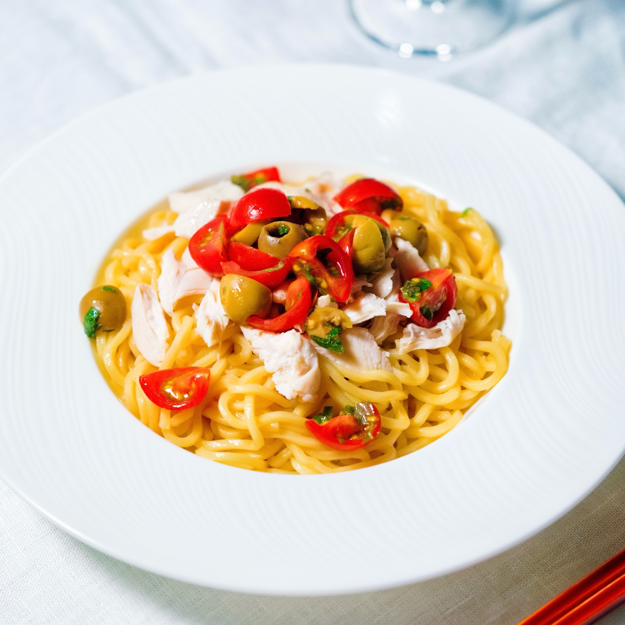 鶏ささ身、オリーブ、ミニトマトの冷やしラーメン 2025.12.04 爽やかな甘さのミニトマトにオリーブの独特の風味がアクセントになった新感覚ラーメン。 にんにくを加えためんつゆベースのたれがクセになるおいしさです。 レシピはこちら (楽天レシピ)