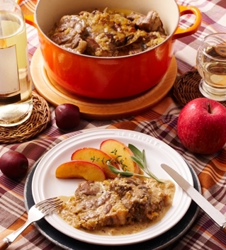 [ル・クルーゼ公式]豚肉のシードル煮焼きりんご添え 2025.12.08 ノルマンディー地方に伝わるシードル煮を作りやすくアレンジしました。りんごから作られるお酒「シードル」は豚肉と相性が良く、風味豊かに仕上げてくれます。 レシピはこちら (楽天レシピ)