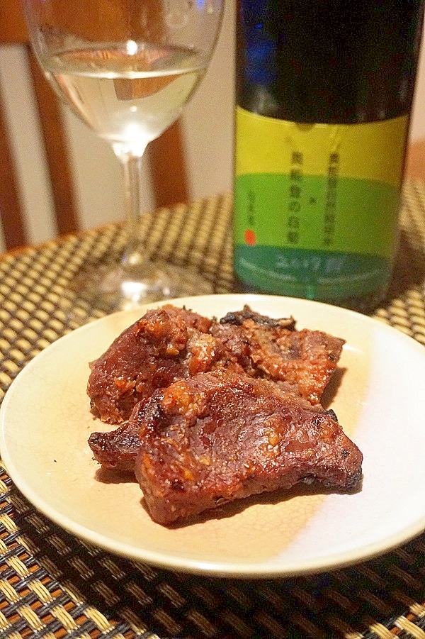 鹿肉を味噌に漬け込んで焼くだけ。日本酒はもちろん赤ワインもご機嫌です。