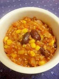秋(9月~11月) 子供も食べられる☆チリコンカン スパイシーでとっても美味しいです♪今回は子供が食べやすいように豆だけではなくコーンをたっぷり入れました★クセになる美味しさでーす♪レシピはこちら(楽天レシピ) 2025.11.04 秋(9月~11月)