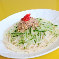 きゅうり・梅肉・生姜とサバ缶を使った夏らしい冷やしうどんです。レシピはこちら(楽天レシピ)