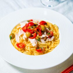 ソース・調味料・ドレッシング 鶏ささ身、オリーブ、ミニトマトの冷やしラーメン