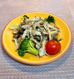 鶏のうま味と白菜の食感をコンソメ味のクリーム(牛乳)がまとめます。アクセントのシメジもイイ感じ。また、下茹で工程などで減塩・低カリウムに配慮しています。レシピはこちら(楽天レシピ)