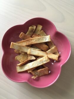 子ども用に蒸したさつまいもが1/2本残っていたので、少ない量で作ってみました。魚焼きグリルで焼くので、オーブントースターがなくても大丈夫です。レシピはこちら(楽天レシピ)