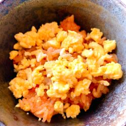 オムライスを炒り卵で作りました。1歳半以降なら何歳でも美味しく食べられます。レシピはこちら(楽天レシピ)
