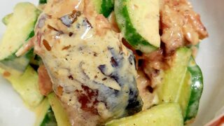 きゅうり・梅肉・生姜とサバ缶を使った夏らしい冷やしうどんです。レシピはこちら (楽天レシピ)