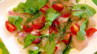 シャキシャキ食感で統一したサラダ。生姜とレモンがさわやかに香る和風ドレッシングを和えました。油っぽいお肉料理との相性抜群です!レシピはこちら (楽天レシピ)