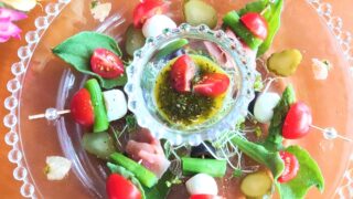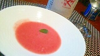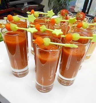 オレンジジュースを加えて飲みやすくした冷製スープ。ショットグラスにいれてパーティーのオードブルにしました。レシピはこちら (楽天レシピ)