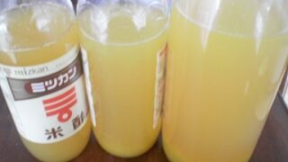 庭の完熟スダチ冷凍室いっぱいなので酢と混ぜて保存するために絞ってますが大きさもまちまちで分量を量りながら同量の酢を加えます。レシピはこちら (楽天レシピ)