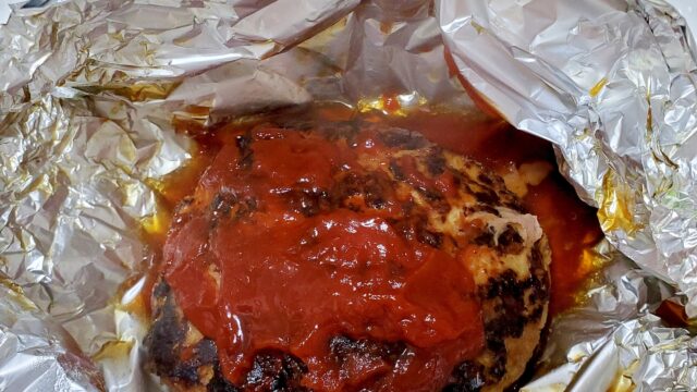 ハンバーグの焼いて、お皿に盛り付けた後洗い物をする時にめんどくさいのでホイル包みにしました。1度焼いて表面はこんがり色は付いてます。レシピはこちら (楽天レシピ)