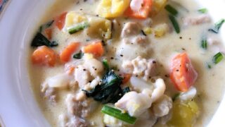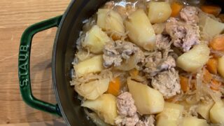 常備している食材で作る無水カレー。鋳物ホーロー鍋に材料を鍋に入れ、軽く炒めて蓋をして煮込むだけ。野菜の甘みたっぷりで食べやすいので、お子さまにも。レシピはこちら (楽天レシピ)