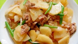 新じゃがいもと玉ねぎ豚肉の焼肉のタレ炒め