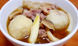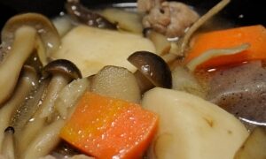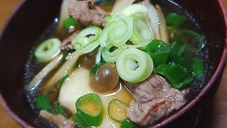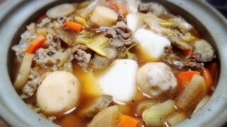 牛肉の旨味が出たすき焼きの様な甘口の出汁に根菜たっぷり!!ホクホクねっとりとした里芋が美味しい♪お餅を加えて、これ1品で満足出来ます(*^^*)レシピはこちら (楽天レシピ)